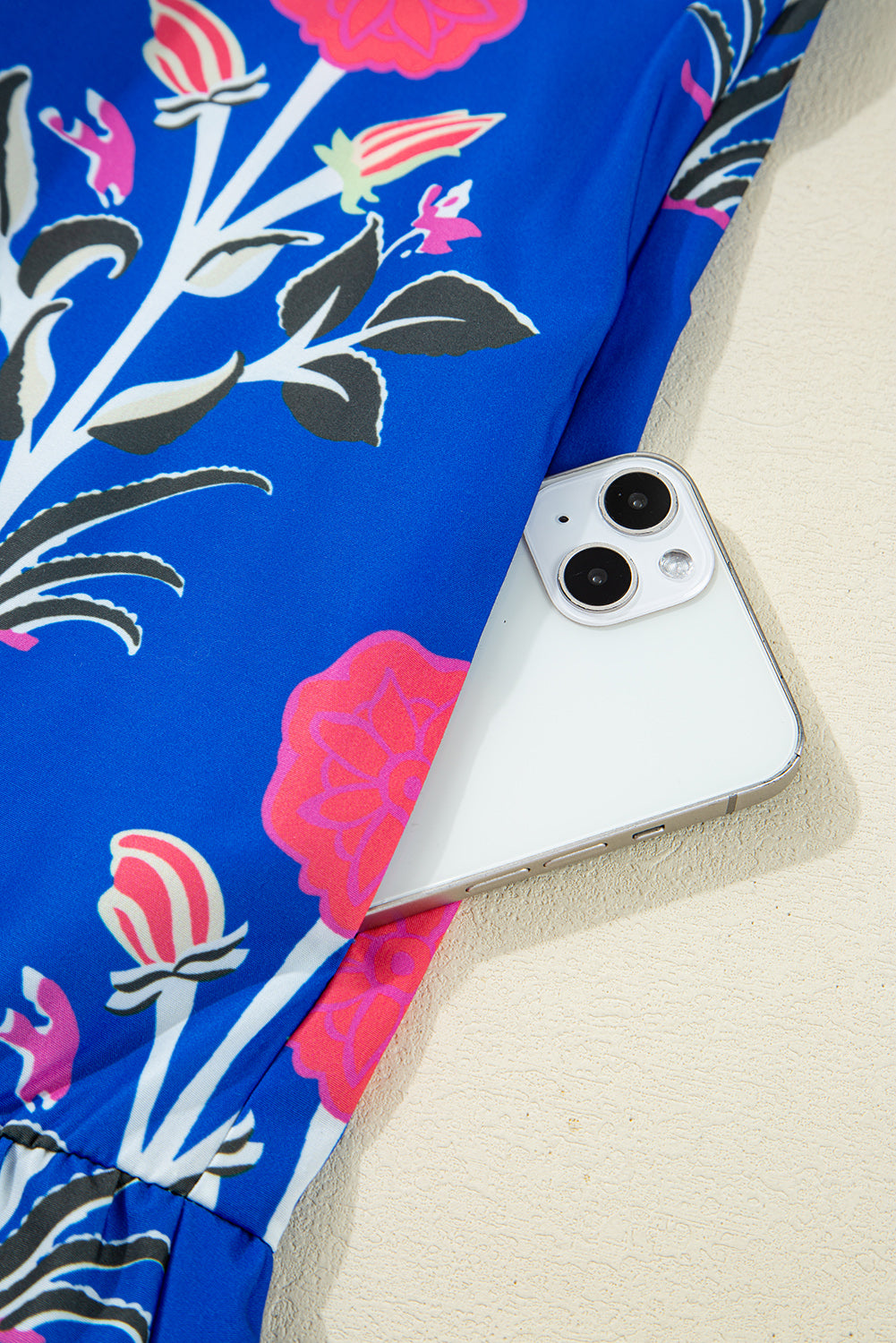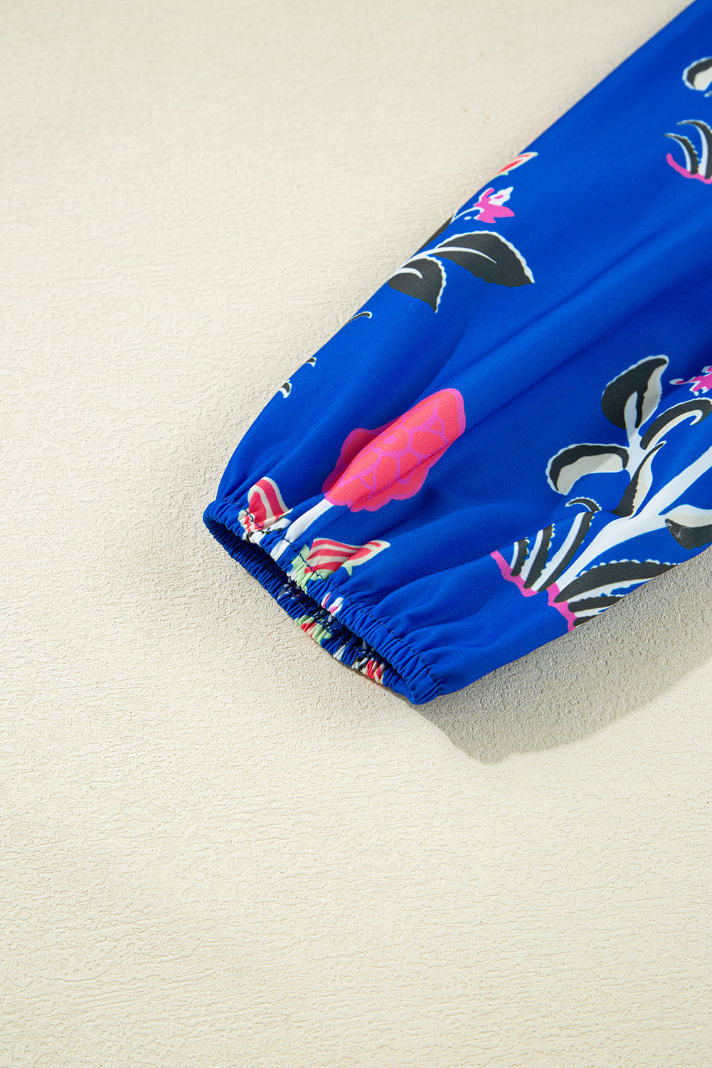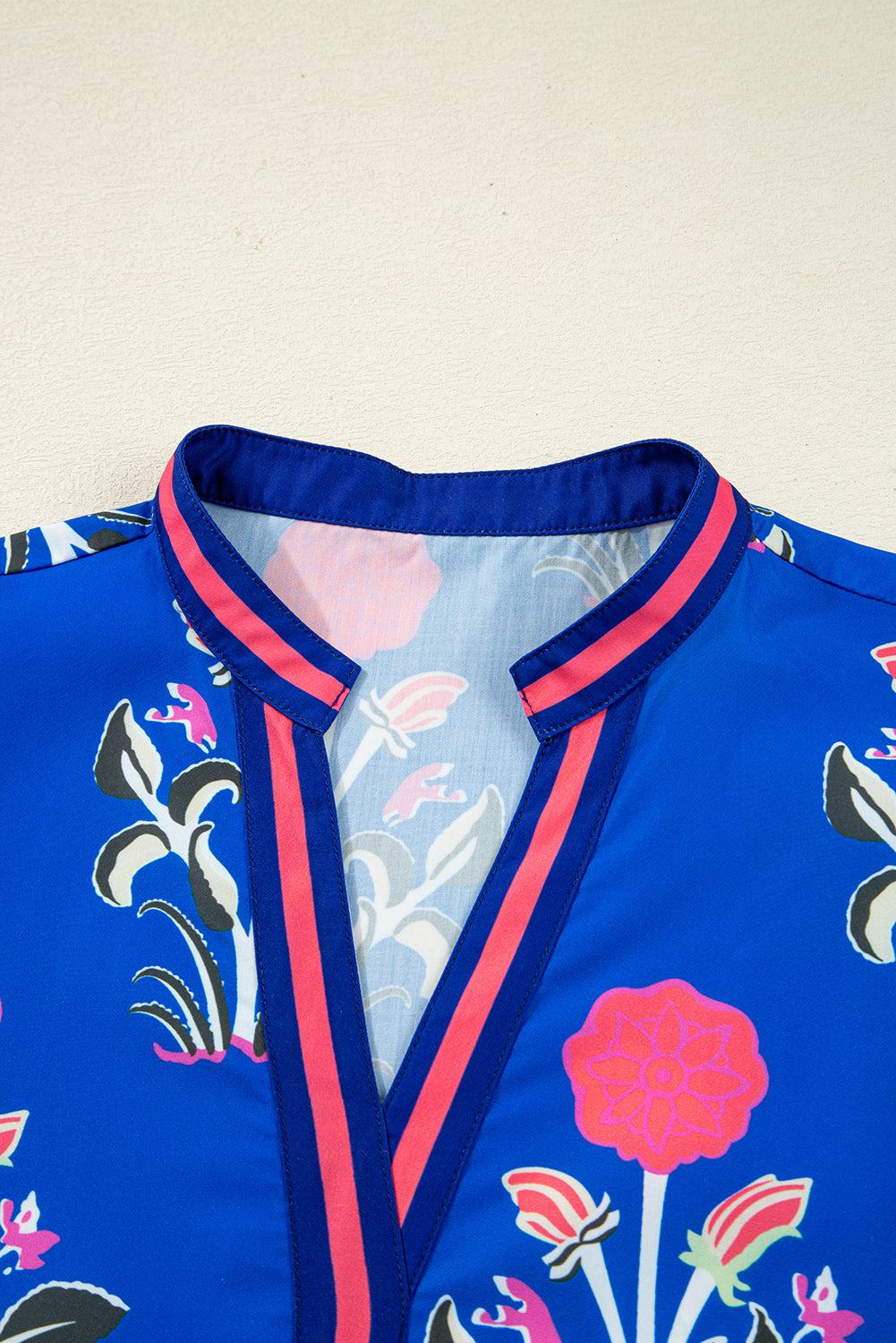 Sky Blue Floral Print Contrast Striped Trim Notched Neck Long Sleeve Dress