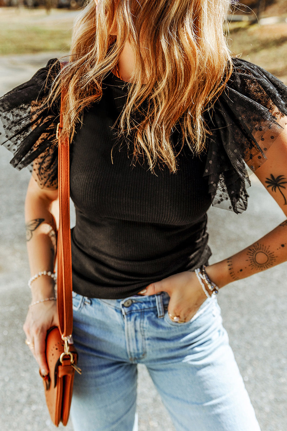 This Black Dotty Mesh Ruffle Sleeve Ribbed Knit Top is designed to flatter your silhouette with its slim fit. Featuring a classic crew neckline, stylish mesh sleeves, and soft ribbed fabric in a solid color, it offers both comfort and elegance. Perfect for pairing with shorts, skirts, jeans, or pants, this versatile top suits summer, vacation, office, formal, and everyday wear, making it a chic addition to any wardrobe. Embrace effortless style and confidence for any occasion.