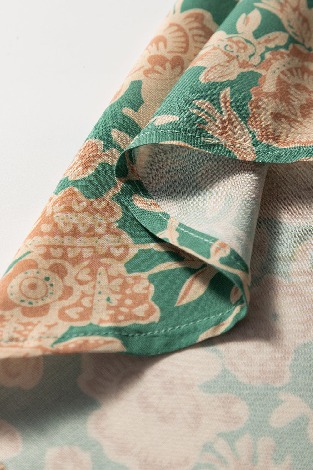 Green Floral Print Pleated Buttoned V Neck Short Sleeve Blouse