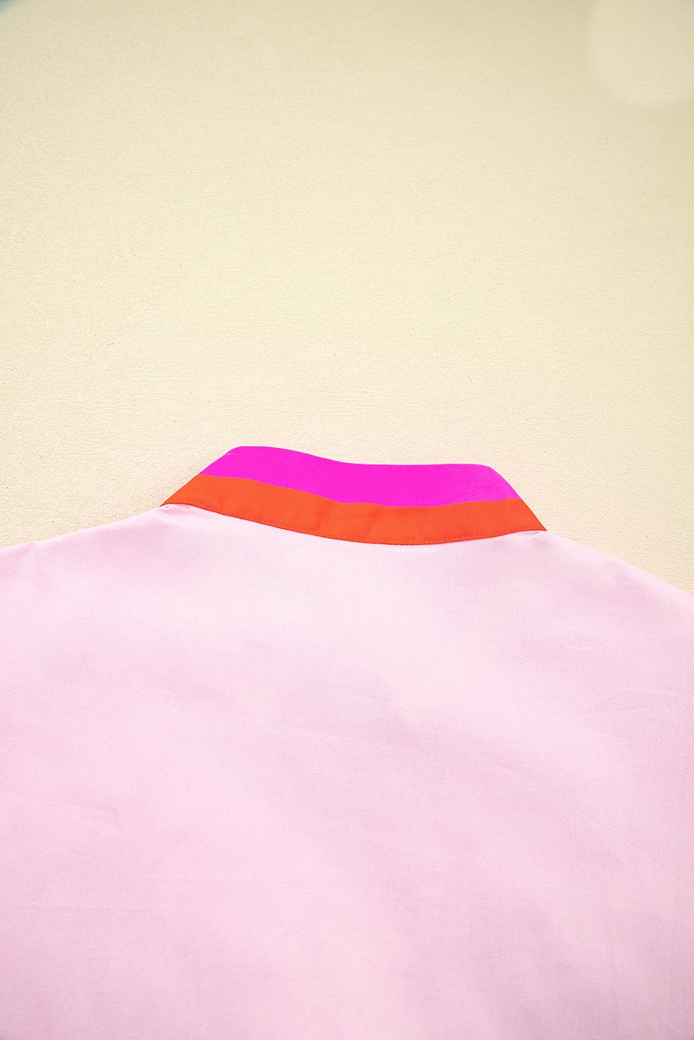 Pink Contrast Striped V Neck Collision Short Puff Sleeve Blouse