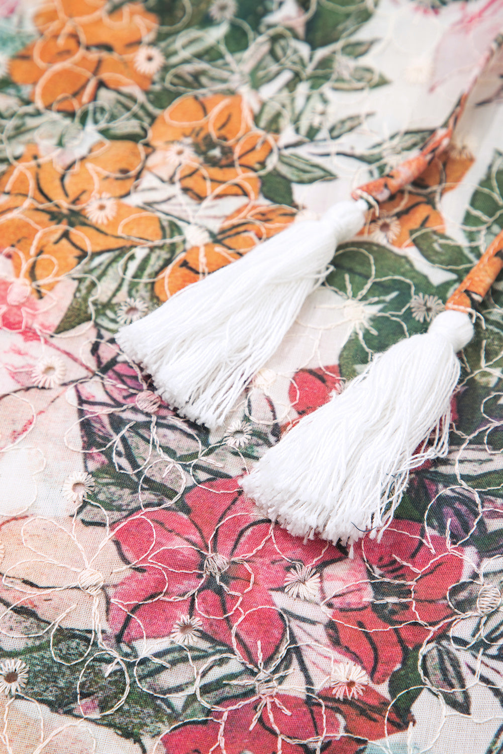 - Floral print blouse with delicate lace embroidery details.