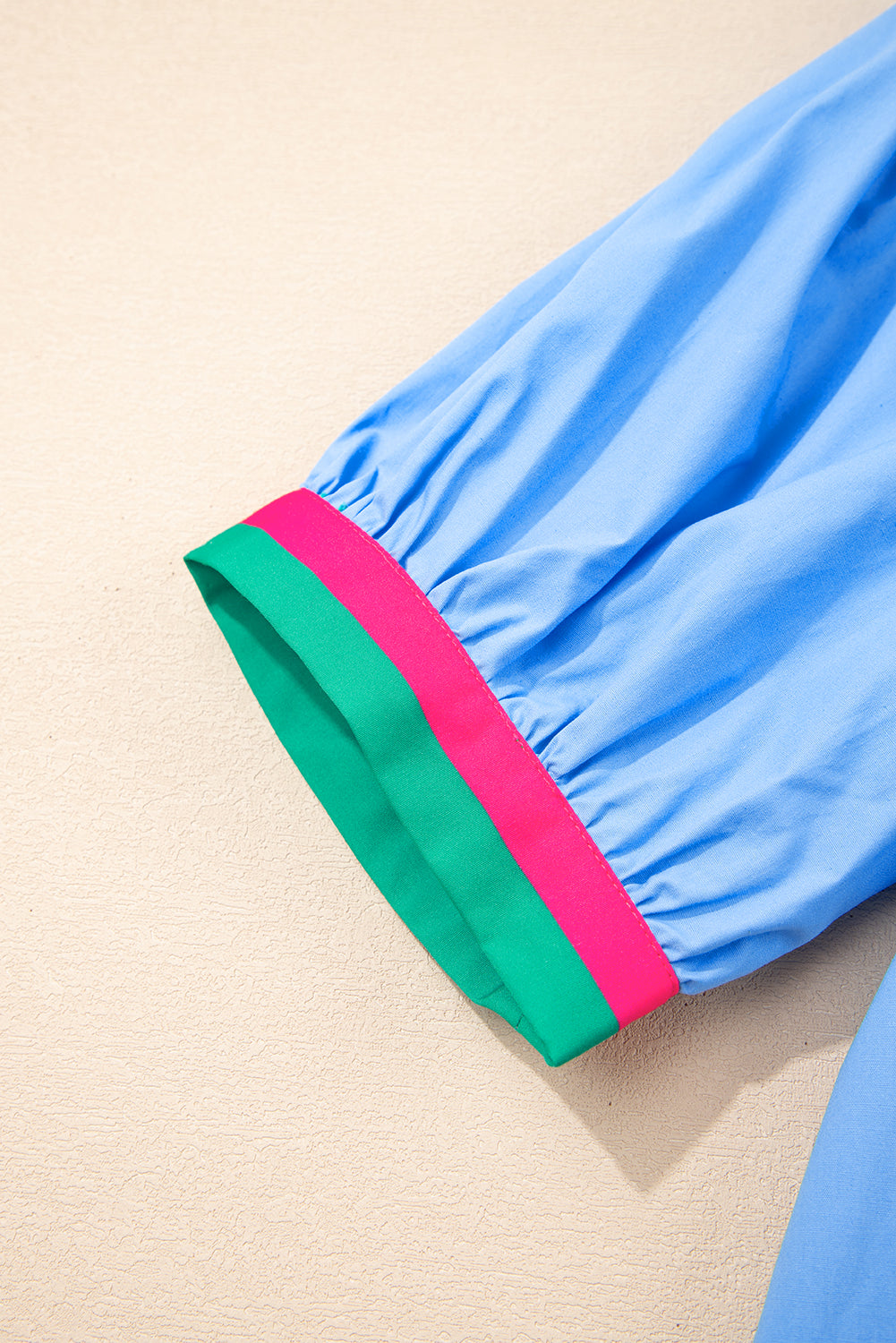Sky Blue Contrast Striped V Neck Collision Short Puff Sleeve Blouse